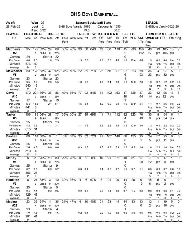BHS Boys Varsity | 20 | 25 | 14 | 18 | 77 |