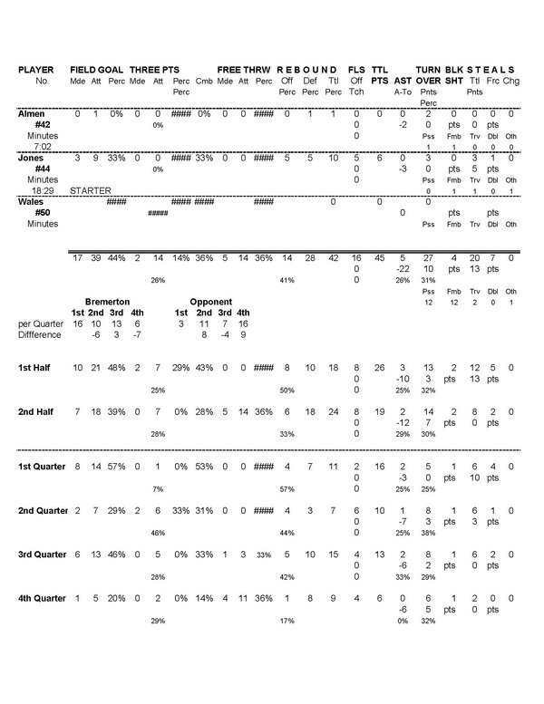 | Team Stats | 19 | 53 | 35.8 | 17 | 39 | 43.6 | 2 | 14 | 14.3 | 5 | 14 | 35.7 | 14 | 28 | 42 | 5 | 31 | .2 | 20 | 4 | 6 | 16 | 45 | ||