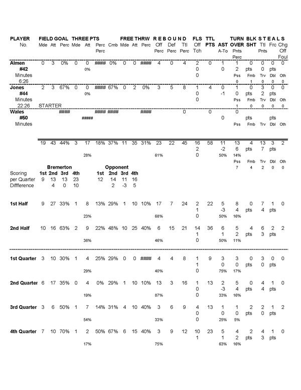 | Team Stats | 22 | 60 | 36.7 | 19 | 43 | 44.2 | 3 | 17 | 17.6 | 11 | 35 | 31.4 | 23 | 22 | 45 | 11 | 13 | .8 | 13 | 4 | 2 | 3 | 18 | 58 | ||
