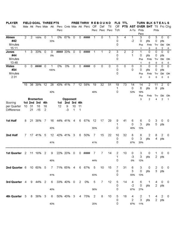 | Team Stats | 27 | 66 | 40.9 | 15 | 38 | 39.5 | 12 | 28 | 42.9 | 7 | 12 | 58.3 | 19 | 32 | 51 | 14 | 14 | 1.0 | 11 | 2 | 2 | 19 | 73 | ||
