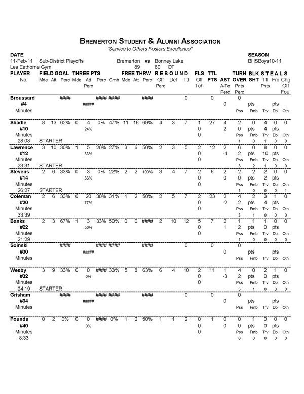 Bremerton—Andrew Shadle 25, Michael Lawrence 12, Kevin Almen 2, Virgo Banks 7, Andre Coleman 23, Isaiah Wesby 11, Marshall Stevens 8, Tim Pounds 2, Shaq Jones.