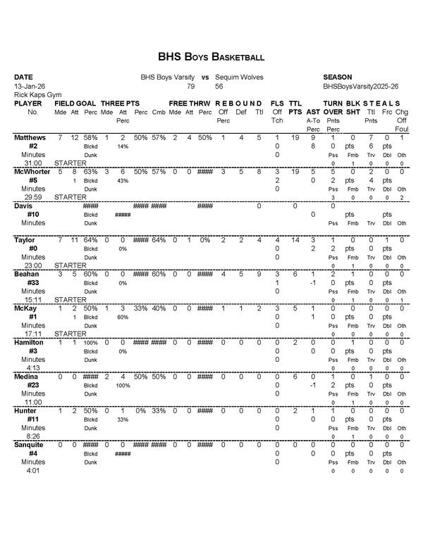 BHS Boys Varsity | 23 | 16 | 24 | 16 | 79 |