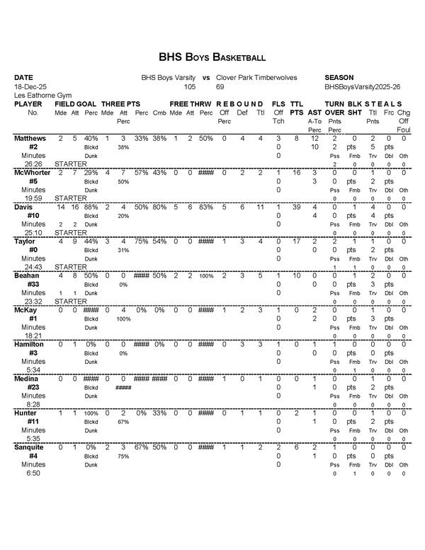 BHS Boys Varsity | 29 | 26 | 30 | 20 | 105 |
