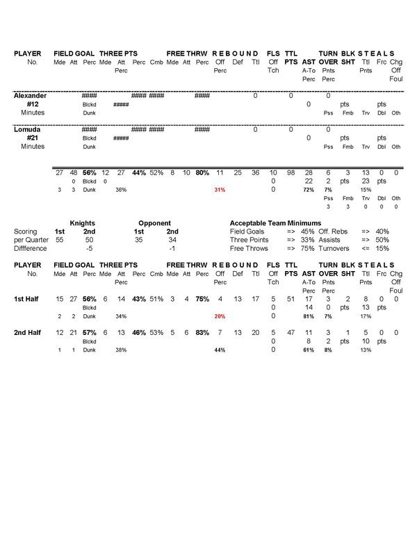 | Team Stats | 46 | 62 | 74.2 | 31 | 44 | 70.5 | 15 | 18 | 83.3 | 8 | 13 | 61.5 | 13 | 22 | 35 | 22 | 6 | 3.7 | 11 | 4 | 8 | 115 | |||