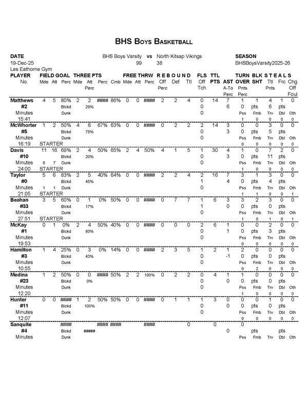 BHS Boys Varsity | 36 | 27 | 23 | 13 | 99 |